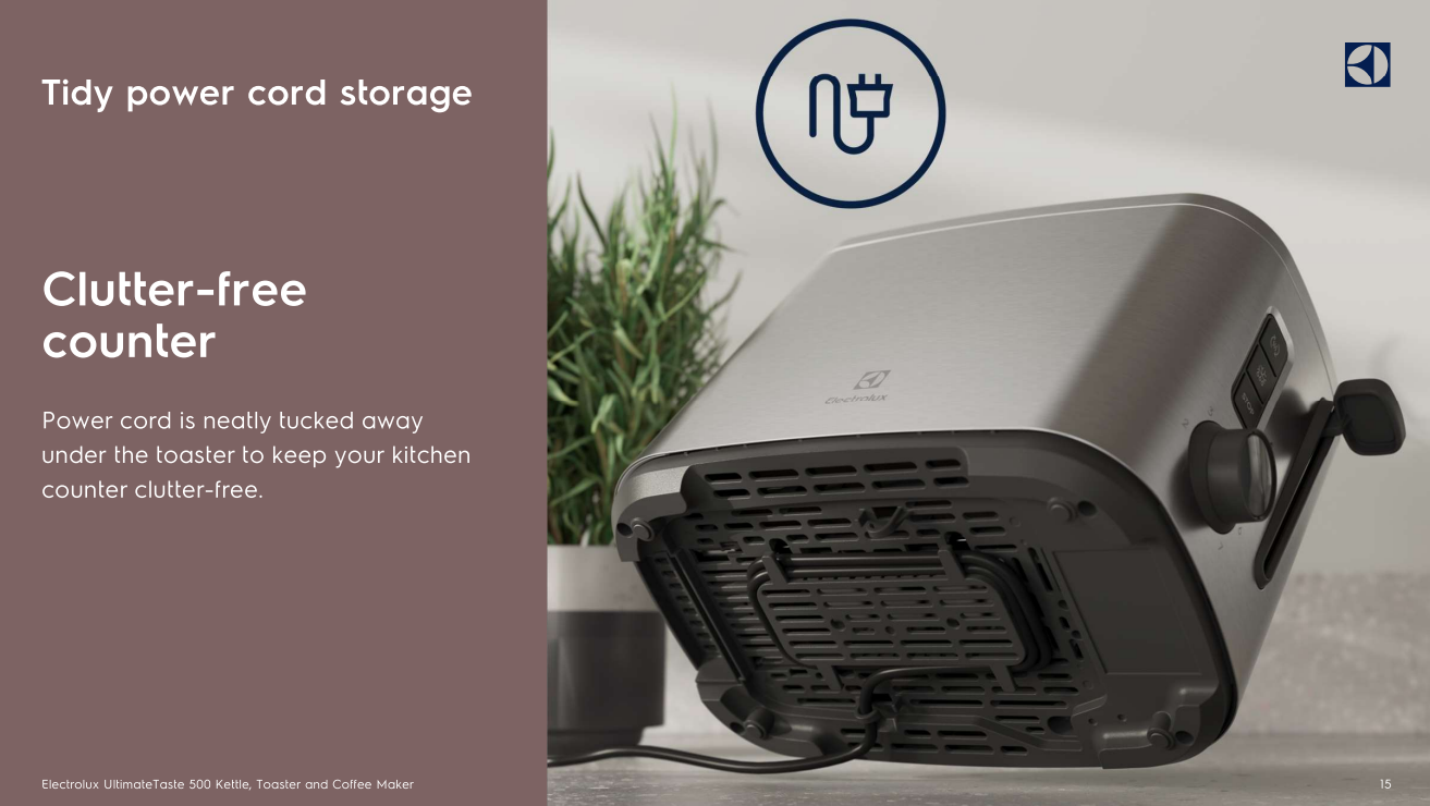 - The power cords are neatly tucked away under the toaster.