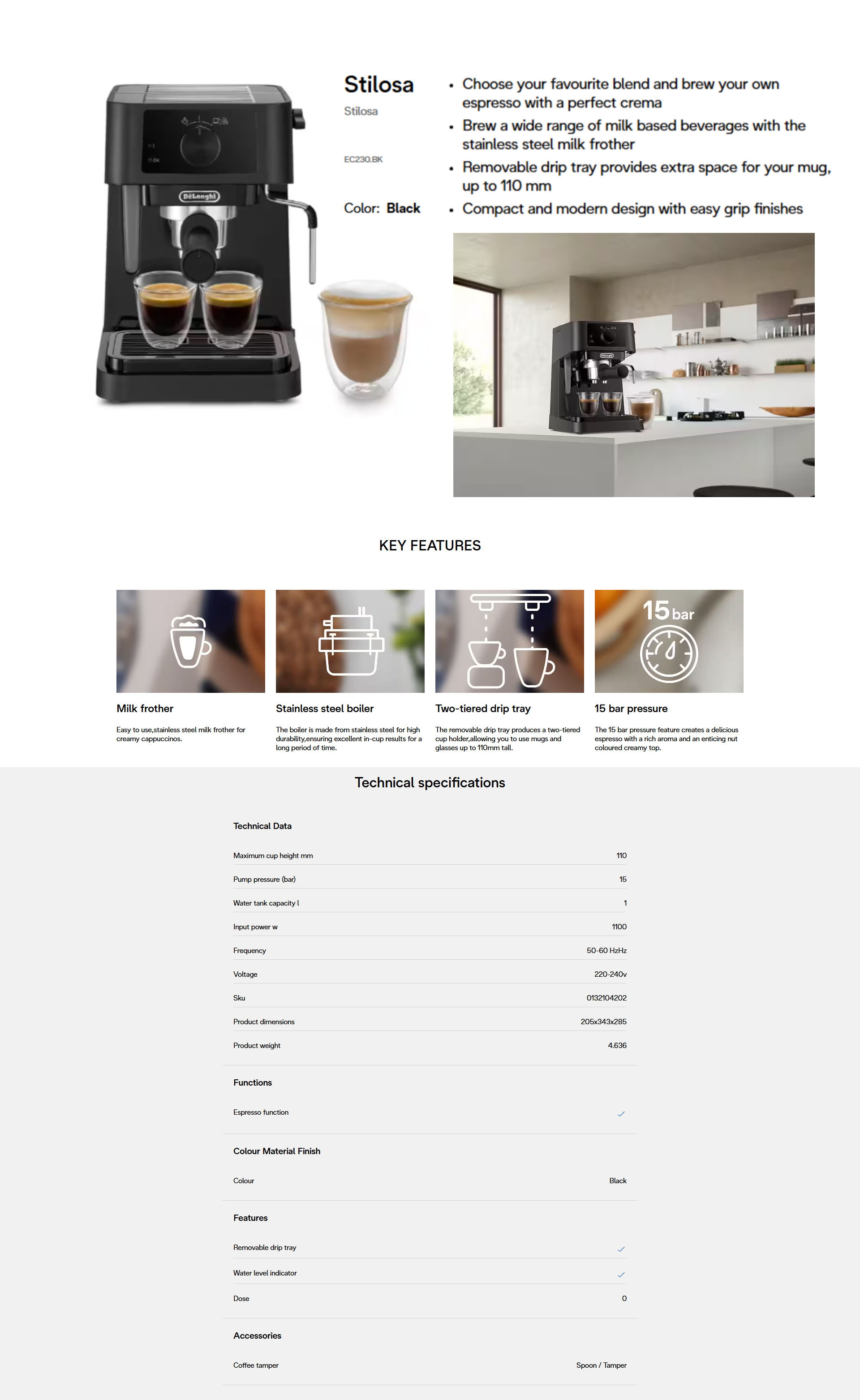 DeLonghi Stilosa Manual Pump Coffee Machine | Pump Espresso | EC230.BK